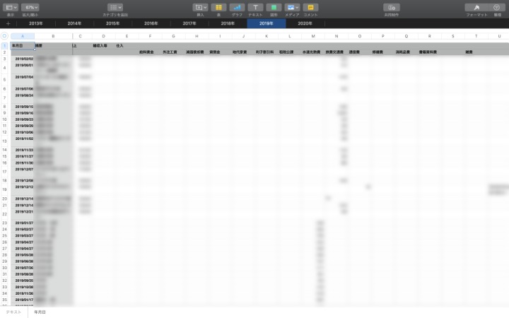 帳簿はMacのNumbersと言う表計算ソフトを使っている。sumで自動計算されるようになっている。白色であれば専用ソフトを使わないでも大丈夫だ。