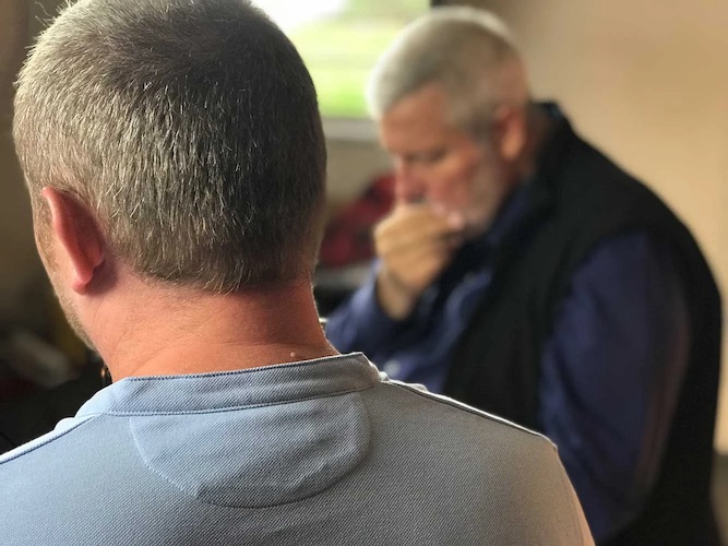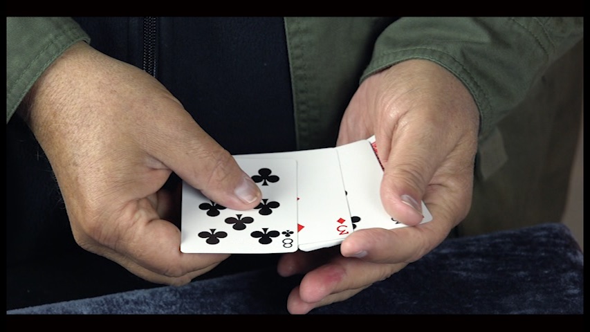 客がデックをファンにして自分のカードを見ているのをマジシャンが見てカードを当てる。