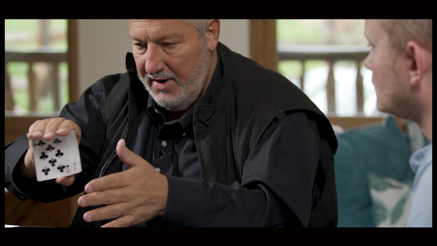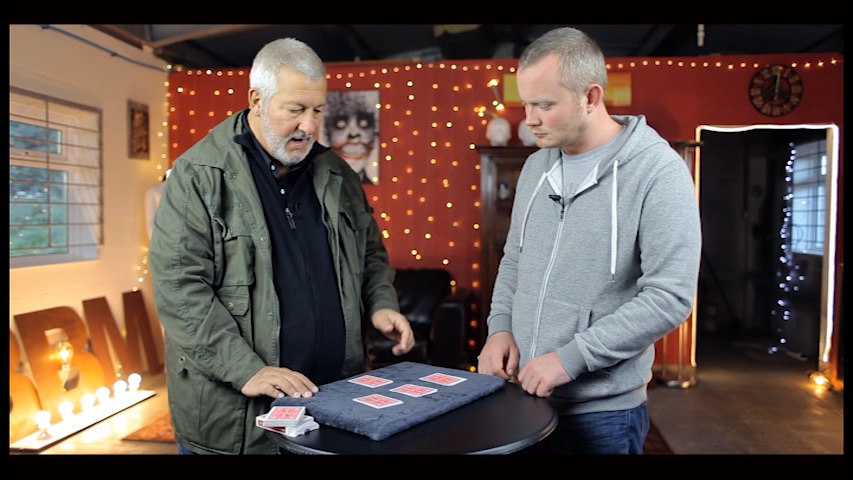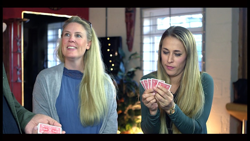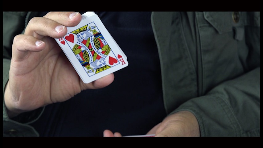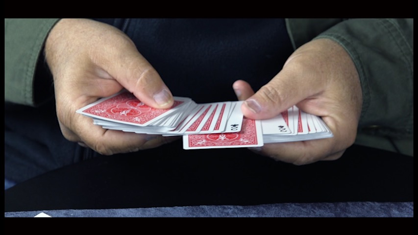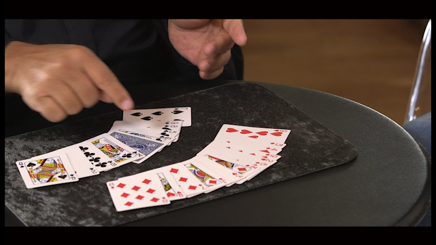 マジシャンが色、数字か絵札か、数字、スーツの順番で聞いていく。最後に決まったカードがデックの中からサンドイッチされた状態で出てくる。