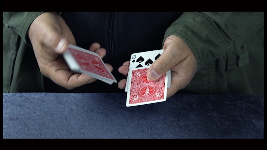 マジシャンが選んだカードは客のカードでないがデックに半分刺さった状態で半回転させると客のカードに変わる。