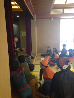 8. 英語教室で子ども向けのハロウィーンパーティー。鞄は床に置いている。