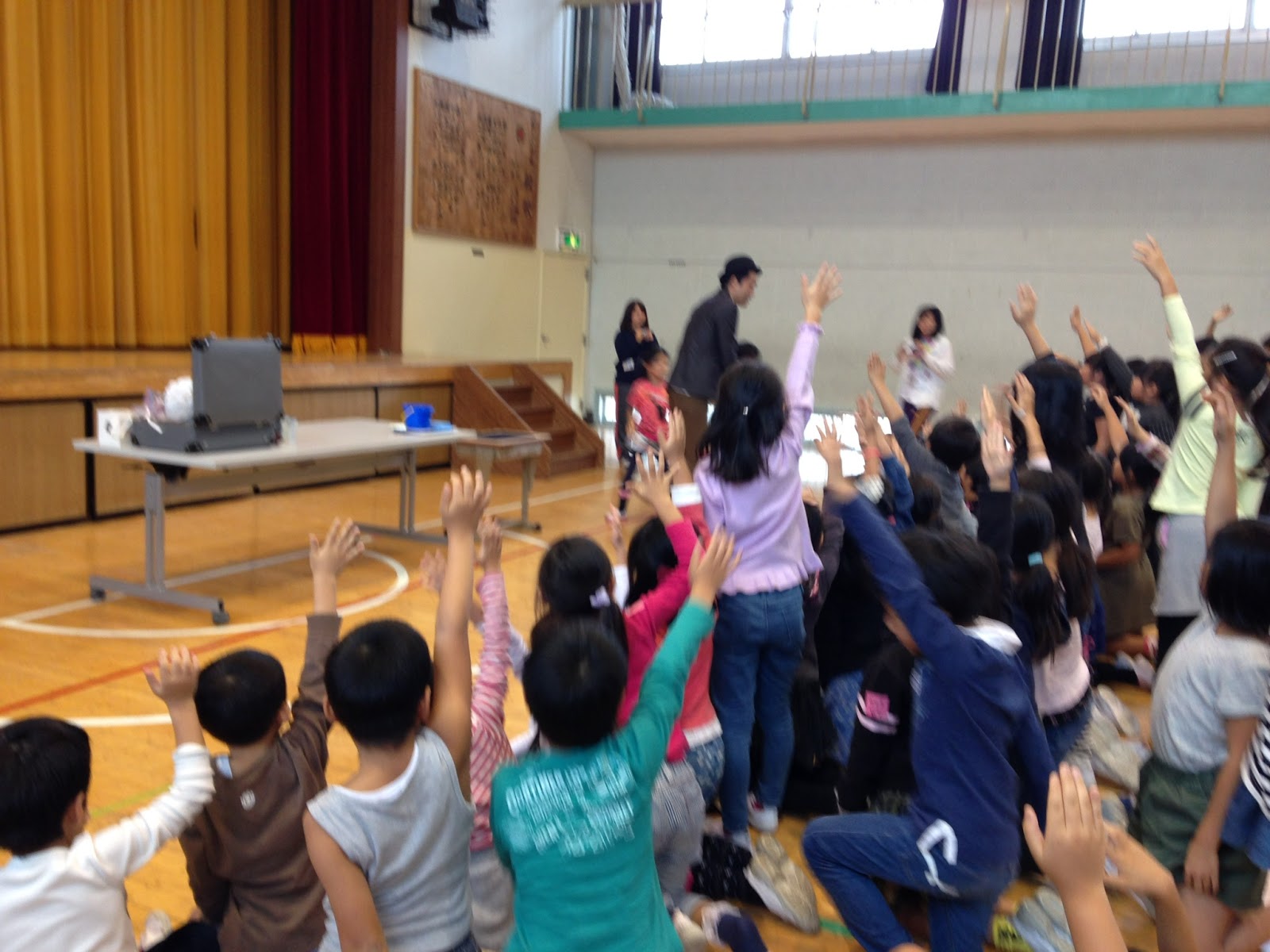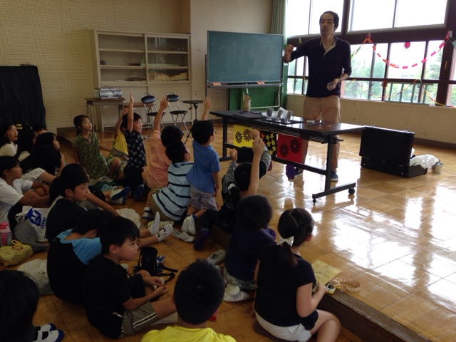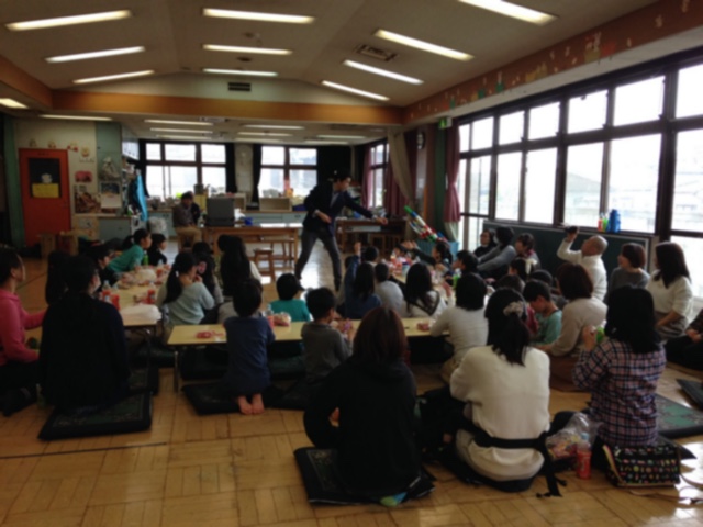 1. 公民館で子どもたちは畳敷きの上に直に座っている。目線の高さに合わせたかったのでステージの上に鞄を横に置いてマジックをやっている。