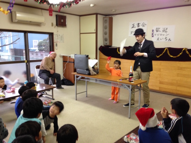 2. 習字教室でクリスマスマジックショー。長テーブルに鞄を置いている。