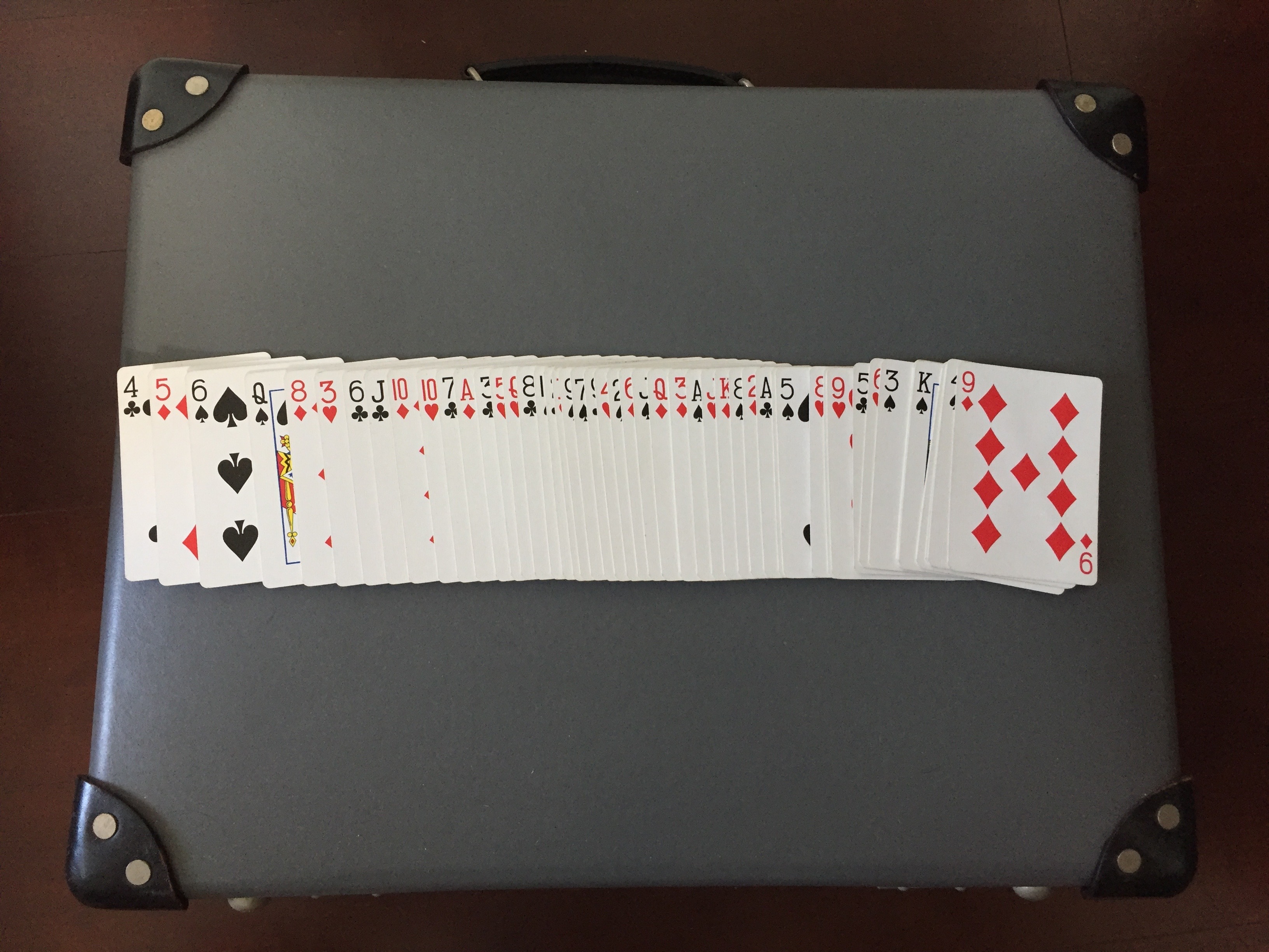 1. 18インチの鞄の上でトランプカードをリボンスプレッドしてみた。多少の膨らみはあるがほぼ平らでぐらつきもほとんどない。