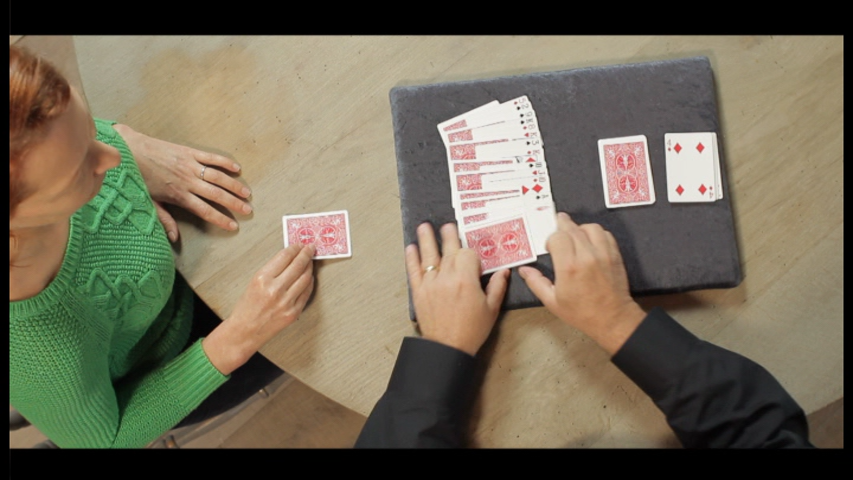 客の好きな時間とその数字に対応するカードがマジシャンの好きな時間を足して客がカットしたデックから配ってパケットを作りそのカードを交互に抜いていき最後に選んだカードが客のカードになる。