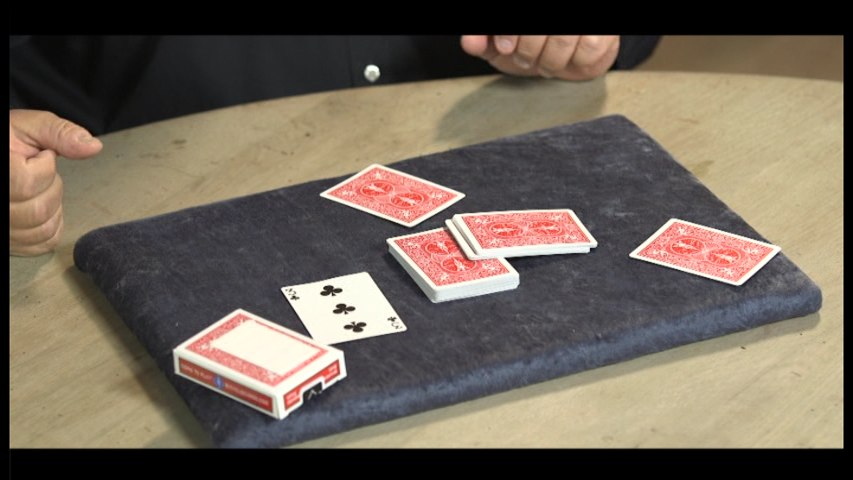シャッフルされたデックから客の前で適当な4枚のフォー・オブ・ア・カインド(同じ数字)をセットするAllan AckermanのProbability Cull の解説。