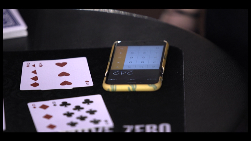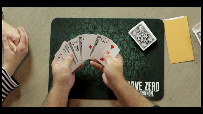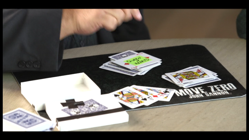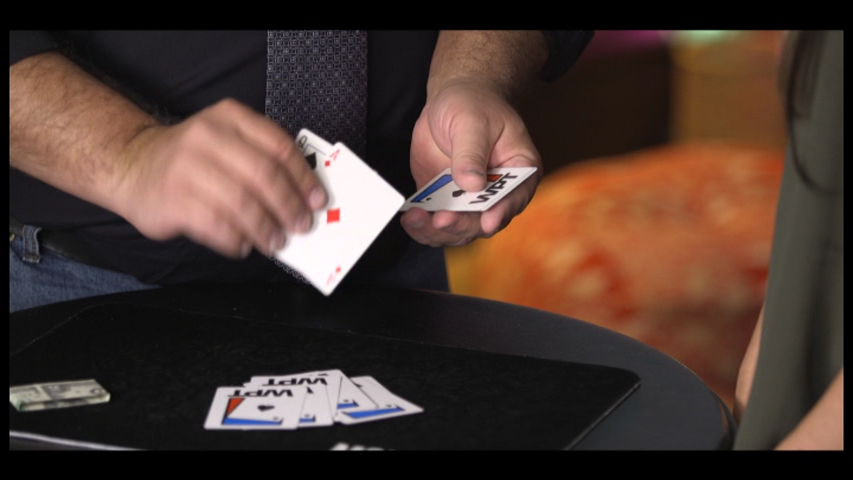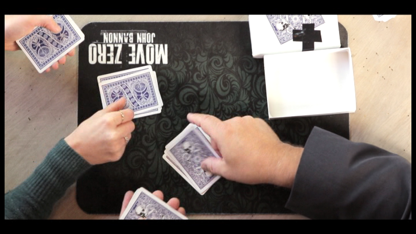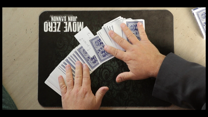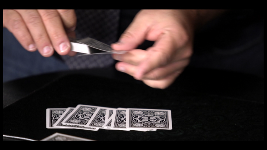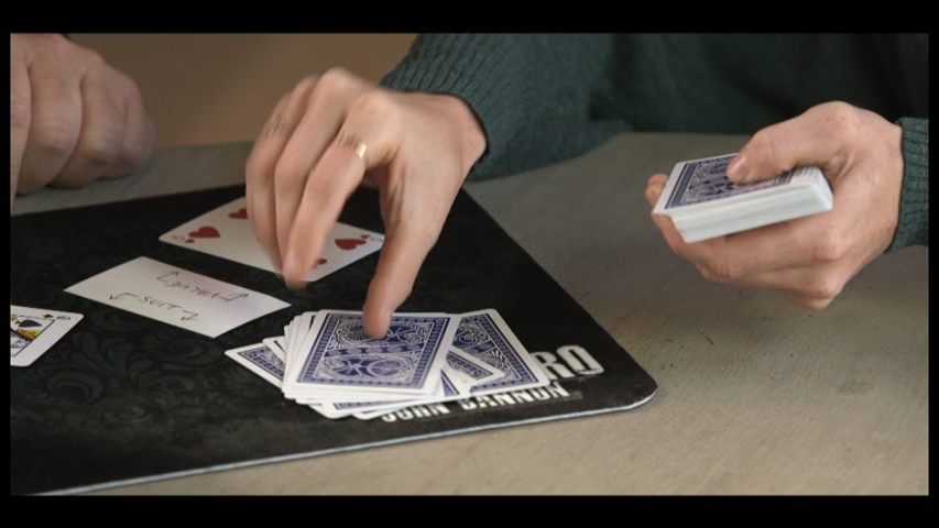 客にデックに名刺を挿してもらい裏を見るとバリューとスーツの矢印が書いてあり両隣のカードのバリューとスーツを見て1枚のカードを決める。そのカードのスペルを言いながら配るとそのカードが現れる。両隣のカードはバリューとスーツを逆にすることも可能。