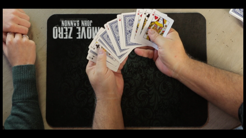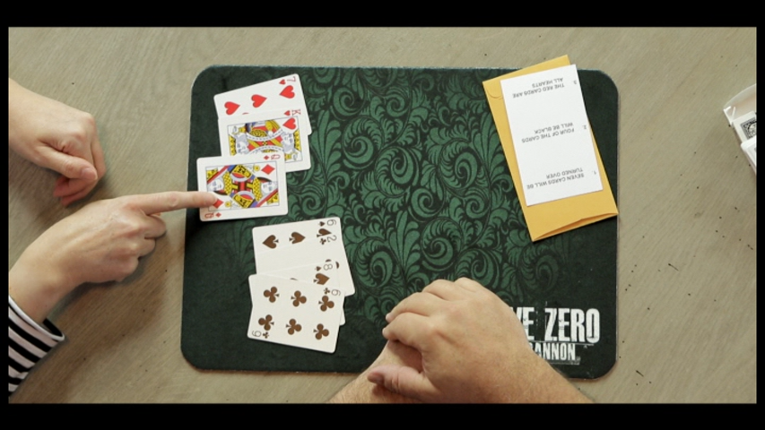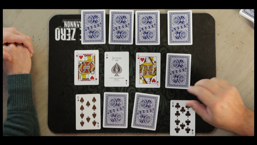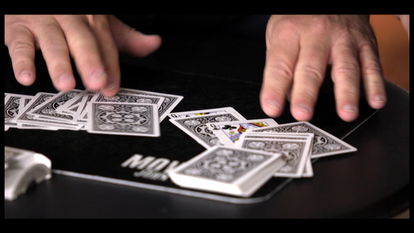 最初から出ていた2枚の黒いQで見つけ出すと言ってデックの中に黒いQを表向きで入れて上と下のカードを同時に配っていく。
