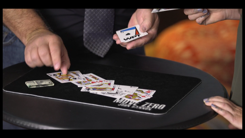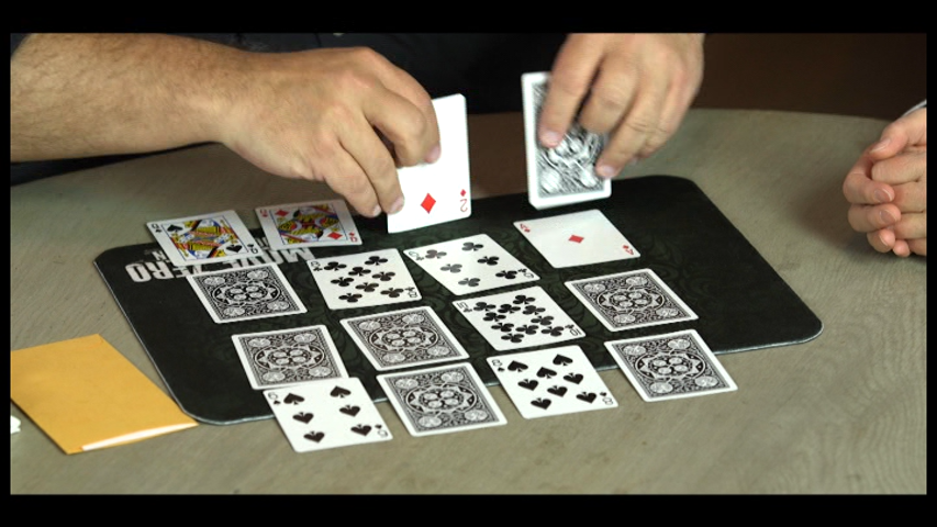 12枚のハイカード(10、絵札、A)をシャッフルして更に裏と表でシャフルして客にもシャフルしてもらう。そしてさらに裏表にしてから4列3行に配っていき客の指示どおりに1列、1行ずつ折りたたんでいく。折りたたんだ後に広げると5枚のカードが表向きになっていてそれがロイヤル・ストレート・フラッシュになっている。