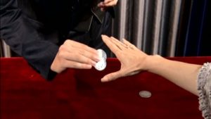 3枚のコインが1枚チャイニーズコインになってそれをしまうを繰り返す。最後は片手でコインを上に投げてチェンジするスーローチェンジ。最後チャイニーズコインになった1枚を手に握ると3枚の銀貨が出現する。