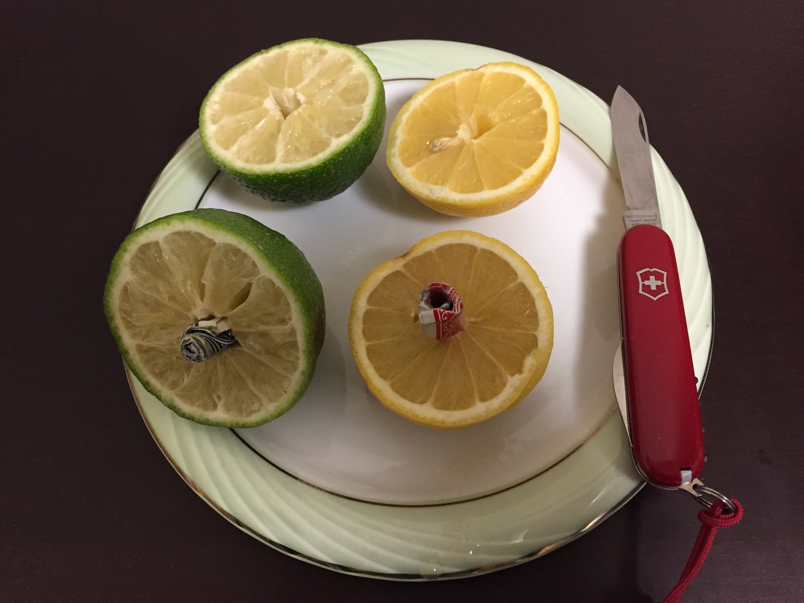 ビクトリーノックスのウェイターでレモンとライムを切ったところ